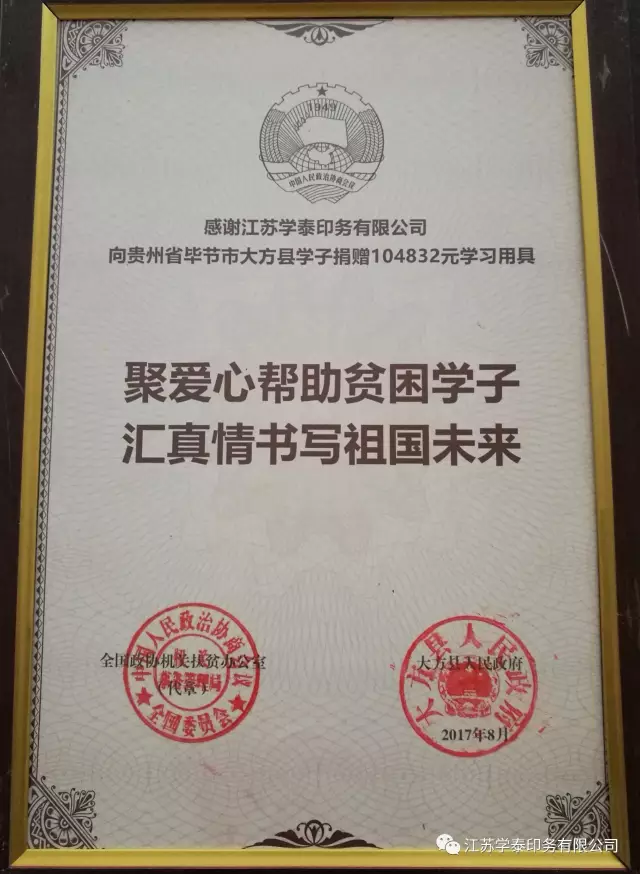 始终以匠心引领文化回归的江苏学泰印务有限公司在努力为社会文化增光添彩的同时,时刻不忘作为企业的社会责任,向贵州省毕节市大方县学子捐赠104832元学习用具。
